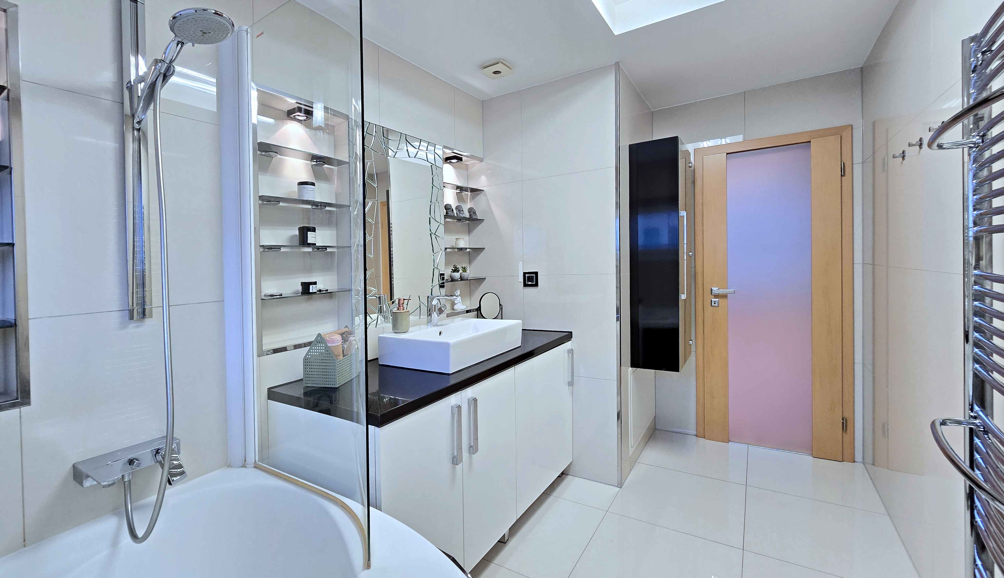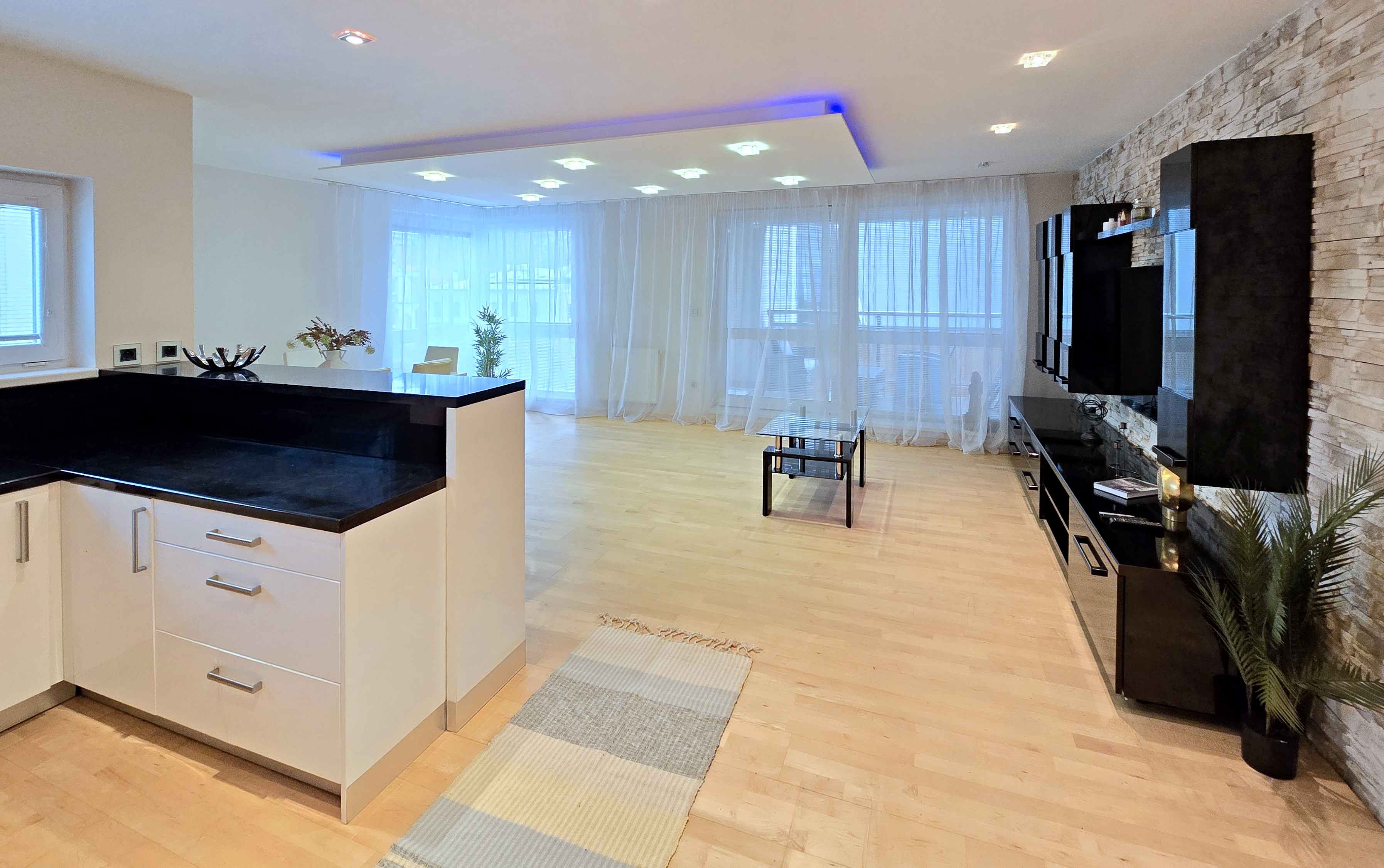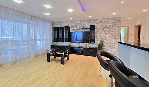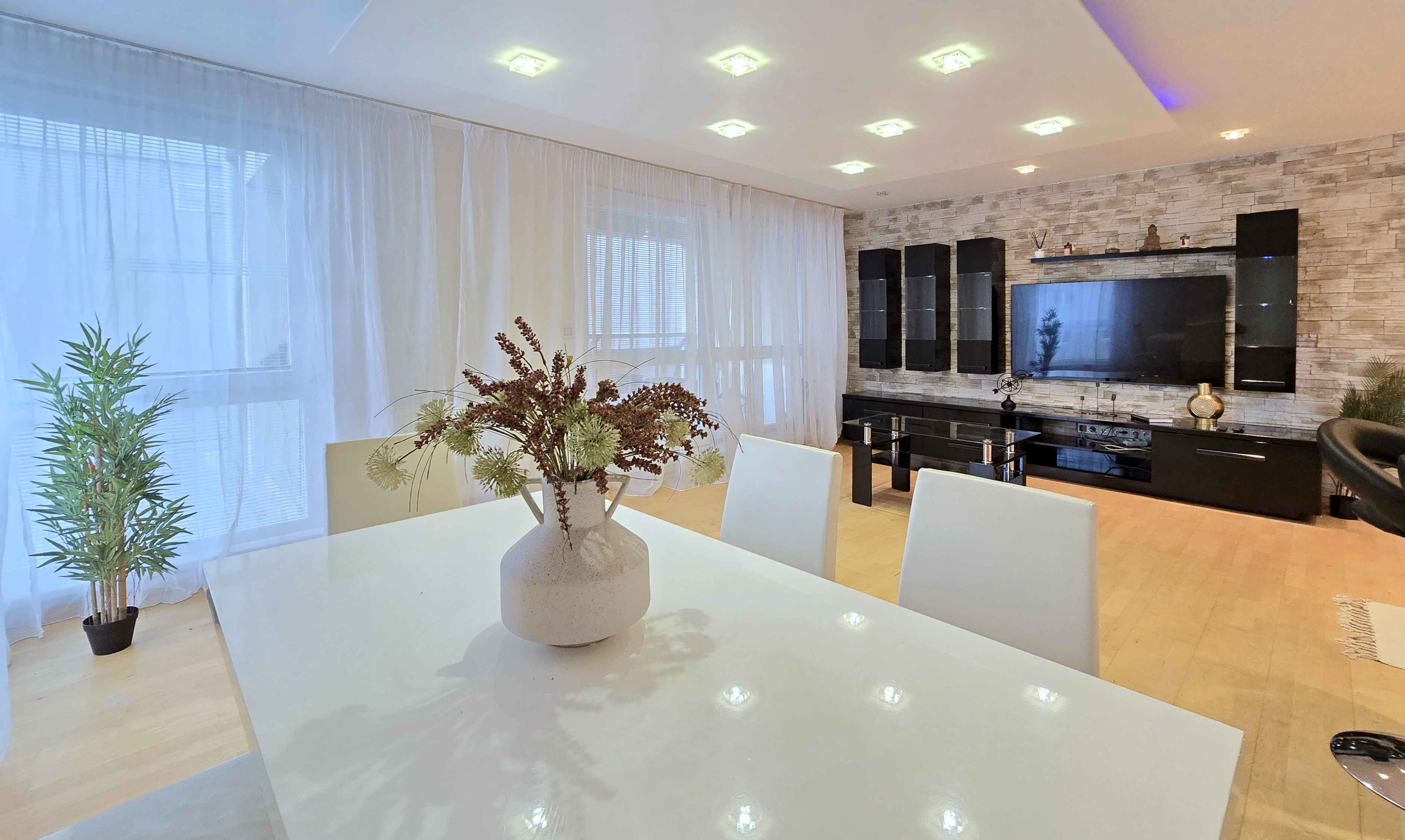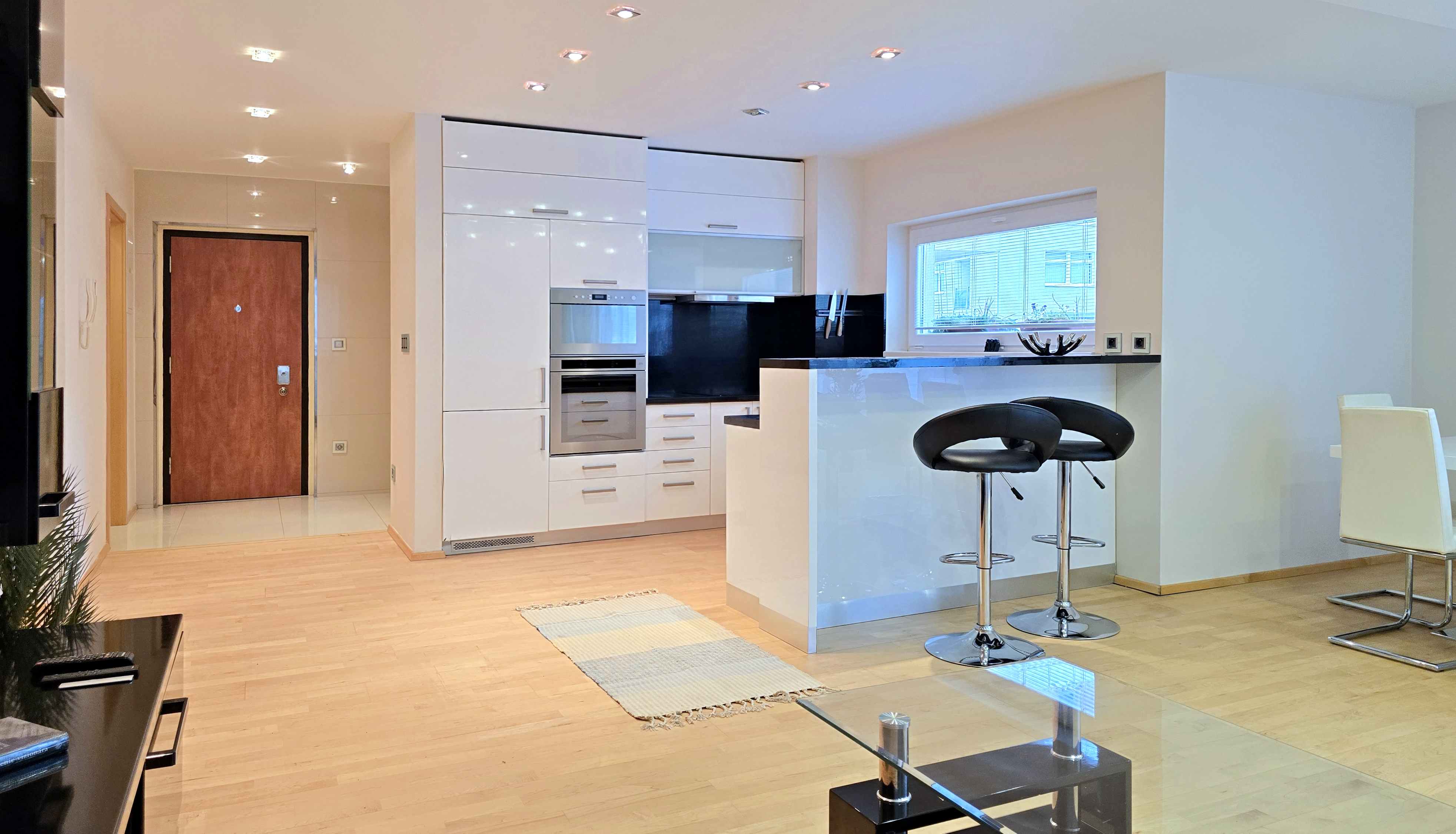 V celom byte sú bodové svetlá, ktoré podčiarkujú moderný charakter interiéru a zabezpečujú príjemnú atmosféru počas dňa aj večer. Kuchyňa je vybavená vstavanými spotrebičmi, byt sa predáva aj zo zariadením a spotrebičmi.