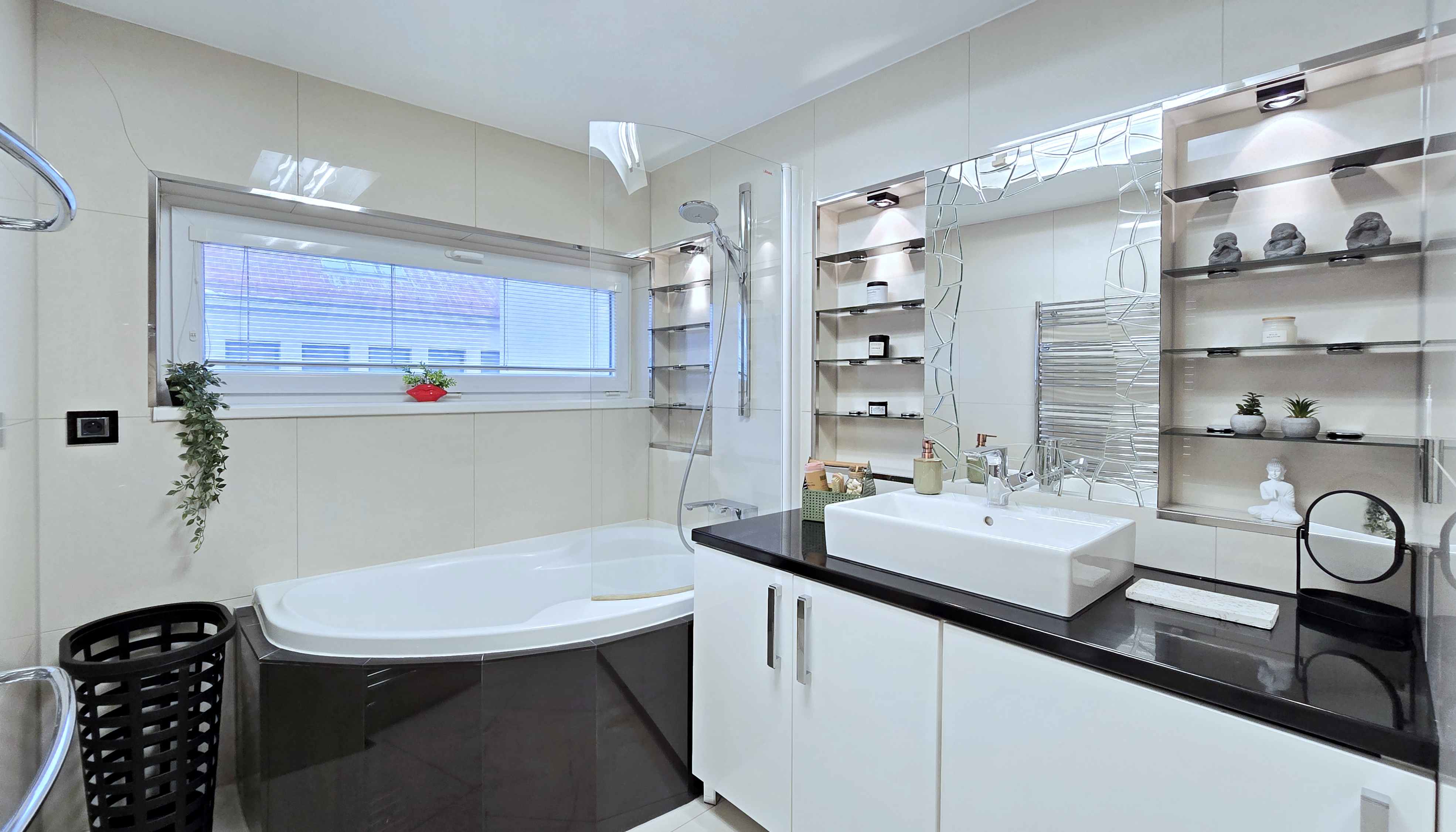 o kúpeľne s rohovou vaňou a oknom,