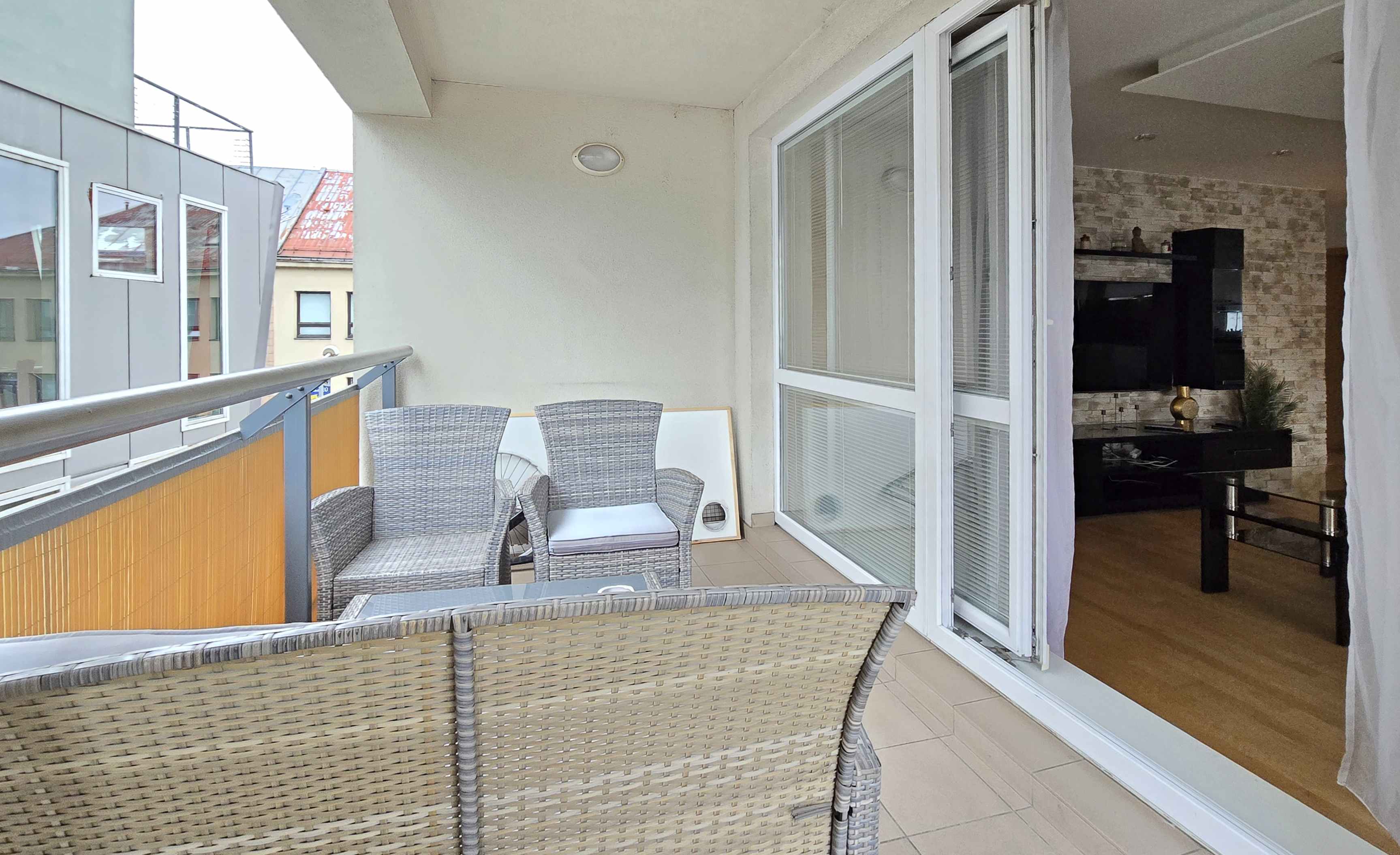 • Terasa – prístupná cez veľké posuvné dvere z obývačky, ponúka príjemné vonkajšie sedenie s výhľadom na mesto.