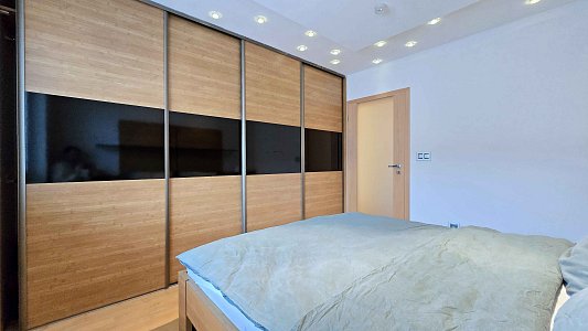 o spálne s manželskou posteľou a šatníkom,