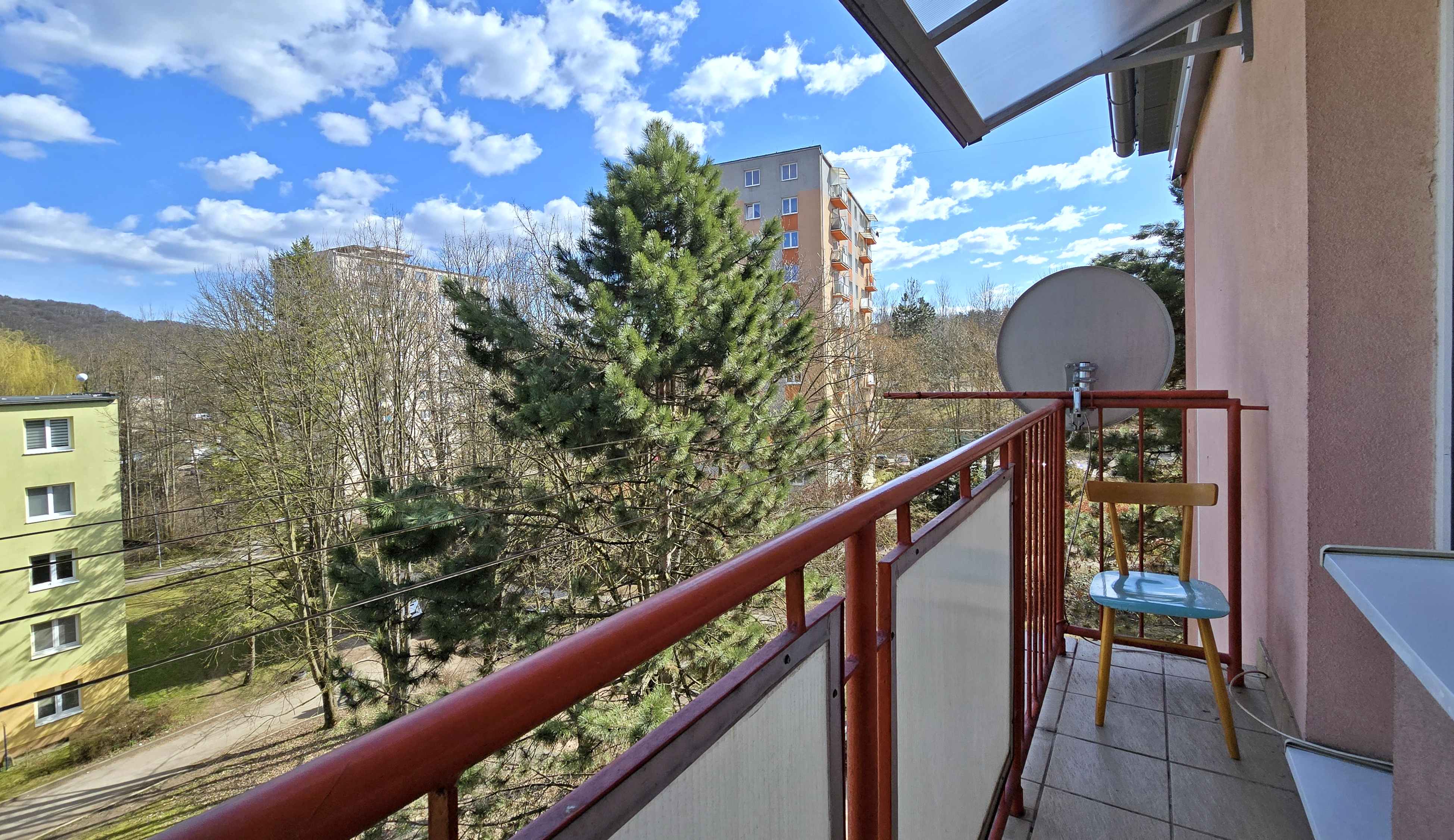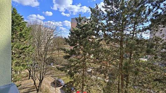 Dispozícia bytu je praktická a funkčná – pozostáva zo vstupnej chodby, samostatného WC, kúpeľne, kuchyne, obývačky s balkónom a dvoch spální. Z balkóna aj izieb je príjemný výhľad na zeleň a krásne borovice, čo dodáva bytu pokojný charakter.