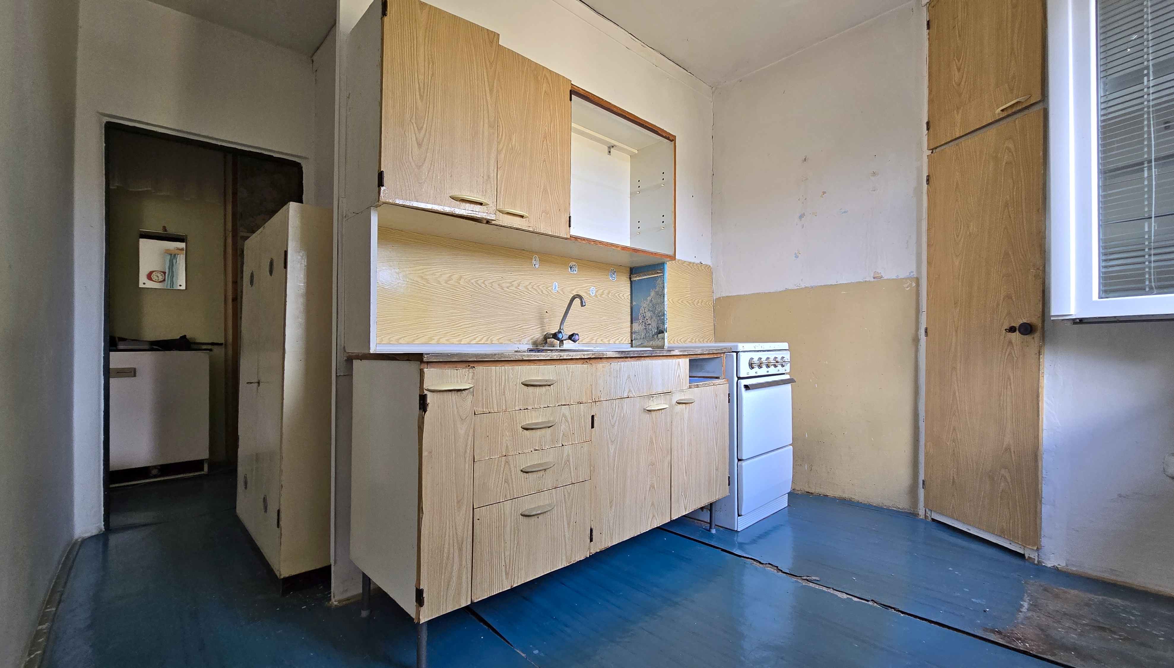 Dispozičnou zmenou bytu získate útulný priestor. Veľkú kúpeľňu spojenú s WC a kucnyňu prepojenú s obývacou izbou.