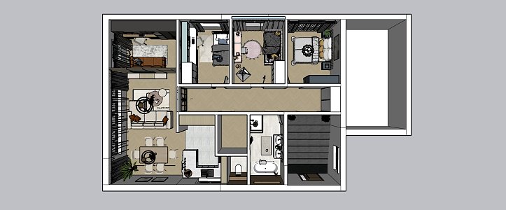 Spolu s dizajnérom sme navrhli otvoriť dennú zónu – prepojiť kuchyňu s jedálňou a obývačkou do jedného veľkorysého priestoru. Spálňu presunúť do novej izby vzniknutej oddelením haly od chodby Pôvodnú spálňu sme zmeniť na pracovňu. Kúpeľňu zväčšiť o vstupnú chodbu a prepojiť s WC, ktoré vzniklo z pôvodnej jedálne. Vznikne tak prehľadná, moderná dispozícia pre pohodlné rodinné bývanie.
