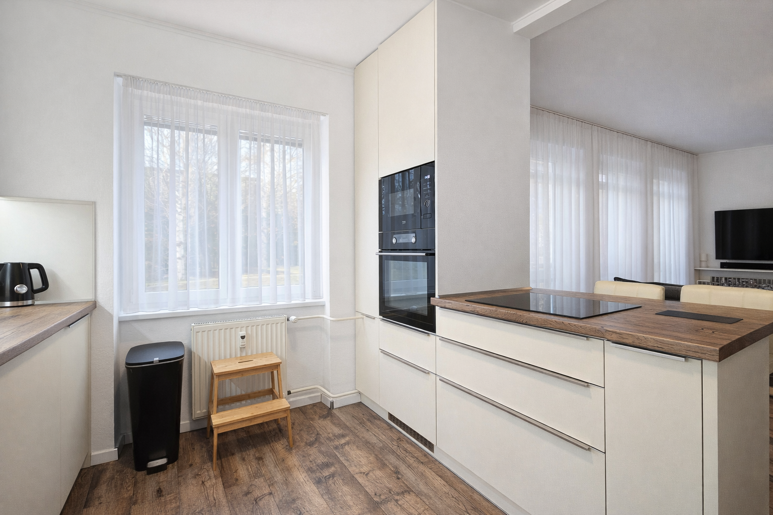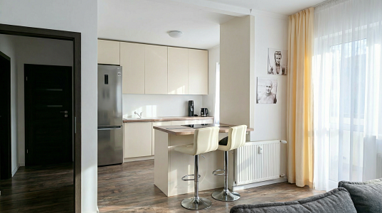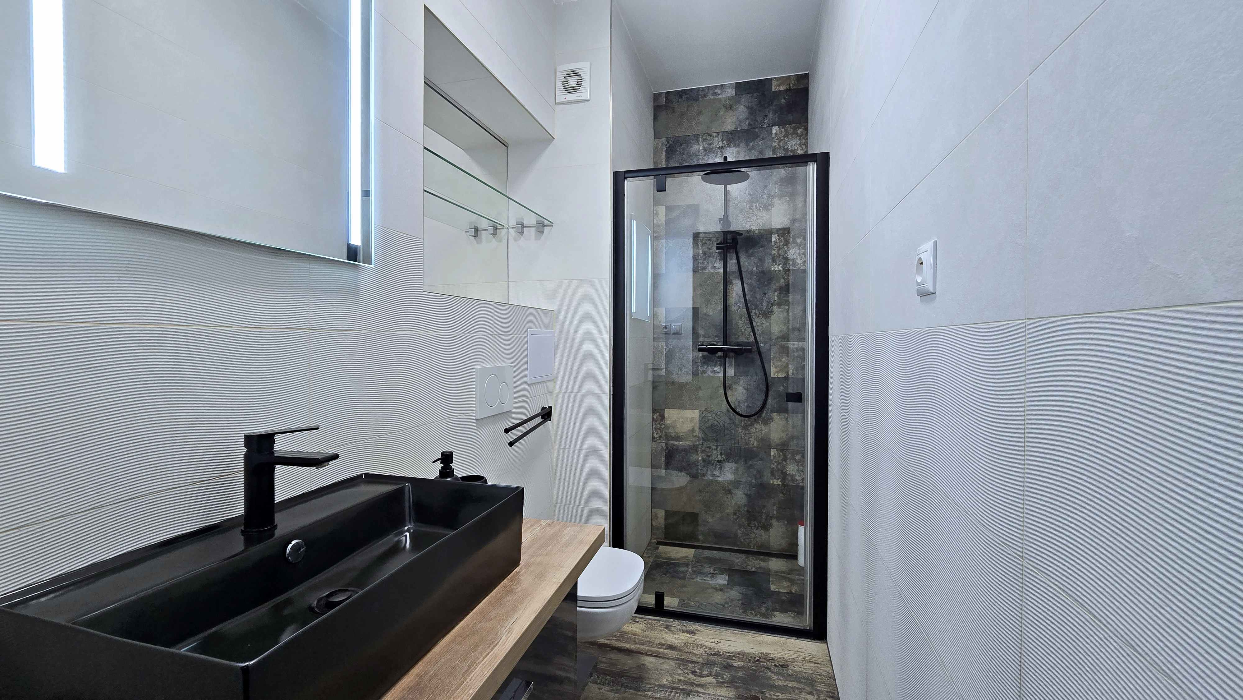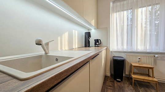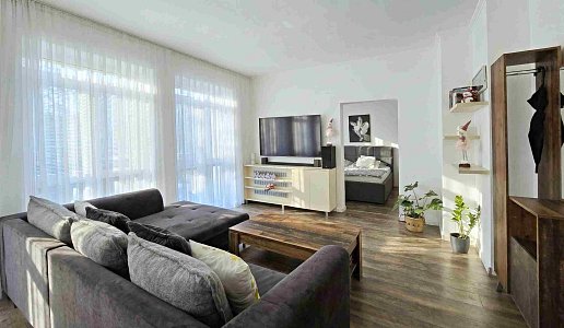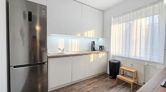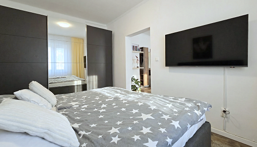 Na obývaciu izbu nadväzuje plne vybavená kuchyňa s barovým pultom, v ktorej nájdete všetky potrebné spotrebiče. Spálňa má veľkú šatníkovú skriňu a smart TV, pôsobí veľmi komfortne a útulne. Kúpeľňa so sprchovacím kútom a WC prešla rovnako ako zvyšok bytu kompletnou rekonštrukciou.