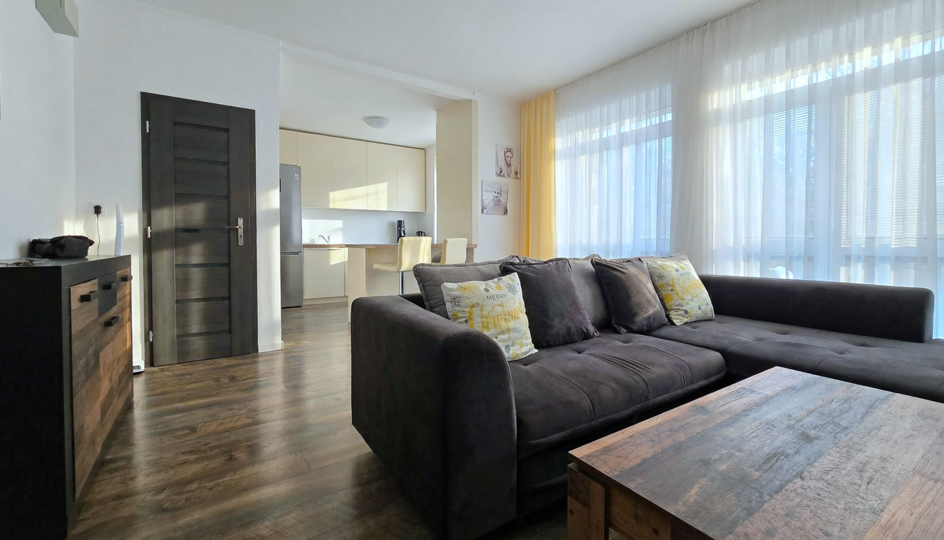 Byt sa nachádza na 1. poschodí a je orientovaný na severnú stranu, vďaka čomu sa neprehrieva. Dominantou je priestranná obývacia izba s tromi francúzskymi oknami, ktorá ponúka priestor na veľkú sedačku aj jedálenský stôl. Z obývačky sa vychádza na veľký balkón, ideálny na rannú kávu či večerné posedenie.